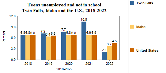 - Teens who were not working, looking for work, or in school made up 2.1 percent of all youth age 16-19 in 2018-2022, compared to 3.7 percent in Idaho.