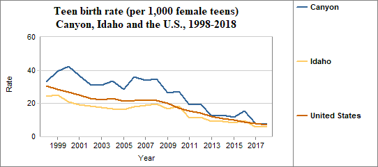 The teen birth rate is calculated by dividing the number of births to females age 15-17 by the number of females in that age group. We multiply the result by 1,000. In counties with relatively few people, a small change in the number of teen births may have a significant effect on rates from year to year. In Canyon. . . - The teen birth rate in 2018 was 7 per 1,000, compared to 6 per 1,000 in Idaho.
