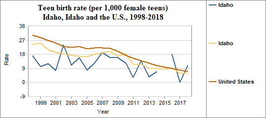 The teen birth rate is calculated by dividing the number of births to females age 15-17 by the number of females in that age group. We multiply the result by 1,000. In counties with relatively few people, a small change in the number of teen births may have a significant effect on rates from year to year. In Idaho. . . - The teen birth rate in 2018 was 11 per 1,000, compared to 6 per 1,000 in Idaho.