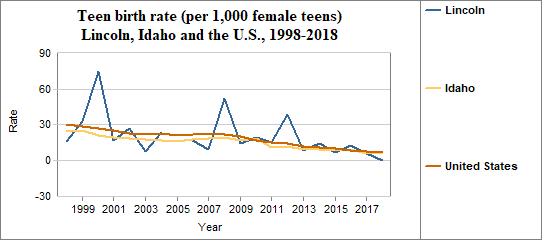 The teen birth rate is calculated by dividing the number of births to females age 15-17 by the number of females in that age group. We multiply the result by 1,000. In counties with relatively few people, a small change in the number of teen births may have a significant effect on rates from year to year. In Lincoln. . . - The teen birth rate in 2018 was 0 per 1,000, compared to 6 per 1,000 in Idaho.