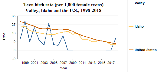 The teen birth rate is calculated by dividing the number of births to females age 15-17 by the number of females in that age group. We multiply the result by 1,000. In counties with relatively few people, a small change in the number of teen births may have a significant effect on rates from year to year. In Valley. . . - The teen birth rate in 2018 was 13 per 1,000, compared to 6 per 1,000 in Idaho.