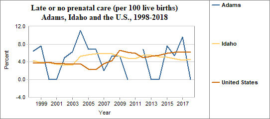 Late prenatal care is the care received starting in the third trimester of pregnancy. This indicator measures live births to mothers receiving no prenatal care in the first and second trimesters. The indicator is calculated by dividing the number of women who receive late or no prenatal care by the number of live births. We multiply the result by 100. In counties with relatively few people, a small number of women who receive late or no prenatal care may have a significant effect on percents from year to year.
