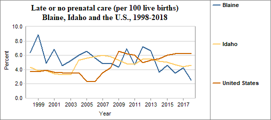 Late prenatal care is the care received starting in the third trimester of pregnancy. This indicator measures live births to mothers receiving no prenatal care in the first and second trimesters. The indicator is calculated by dividing the number of women who receive late or no prenatal care by the number of live births. We multiply the result by 100. In counties with relatively few people, a small number of women who receive late or no prenatal care may have a significant effect on percents from year to year.