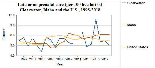 Late prenatal care is the care received starting in the third trimester of pregnancy. This indicator measures live births to mothers receiving no prenatal care in the first and second trimesters. The indicator is calculated by dividing the number of women who receive late or no prenatal care by the number of live births. We multiply the result by 100. In counties with relatively few people, a small number of women who receive late or no prenatal care may have a significant effect on percents from year to year.