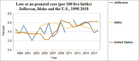 Late prenatal care is the care received starting in the third trimester of pregnancy. This indicator measures live births to mothers receiving no prenatal care in the first and second trimesters. The indicator is calculated by dividing the number of women who receive late or no prenatal care by the number of live births. We multiply the result by 100. In counties with relatively few people, a small number of women who receive late or no prenatal care may have a significant effect on percents from year to year.