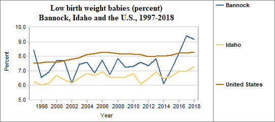 A low birth weight is under 2,500 grams, or roughly 5 lbs 8 oz. The percent of low birth weight babies is calculated by dividing the number of low birth weight babies by the number of live births. We multiply the result by 100. In counties with relatively few people, a small number of low birth weight babies may have a significant effect on percents from year to year. In Bannock . . . - 9.2 percent of babies had low birth weights in 2018, compared to 7.3 percent in Idaho