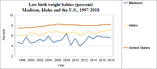 A low birth weight is under 2,500 grams, or roughly 5 lbs 8 oz. The percent of low birth weight babies is calculated by dividing the number of low birth weight babies by the number of live births. We multiply the result by 100. In counties with relatively few people, a small number of low birth weight babies may have a significant effect on percents from year to year. In Madison . . . - 5.7 percent of babies had low birth weights in 2018, compared to 7.3 percent in Idaho