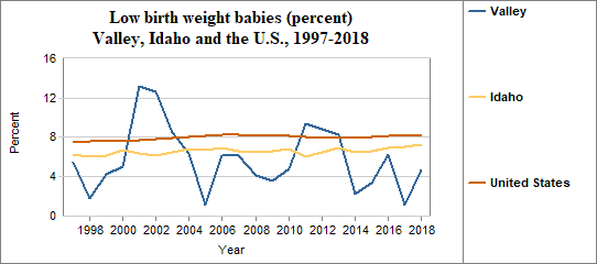 A low birth weight is under 2,500 grams, or roughly 5 lbs 8 oz. The percent of low birth weight babies is calculated by dividing the number of low birth weight babies by the number of live births. We multiply the result by 100. In counties with relatively few people, a small number of low birth weight babies may have a significant effect on percents from year to year. In Valley . . . - 4.7 percent of babies had low birth weights in 2018, compared to 7.3 percent in Idaho