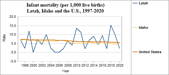 - The infant mortality rate was 2.4 per 1,000 in 2020, compared to 5.1 per 1,000 in Idaho