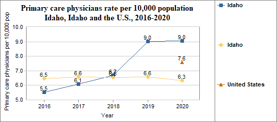 - There were 9.0 primary care physicians per 10,000 population, compared to 6.3 per 10,000 in Idaho