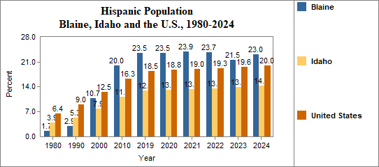 - Hispanic residents made up 23.0 percent of the population in 2024, compared to 14.3 percent in Idaho.