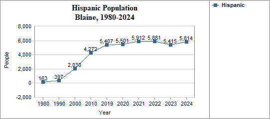 - The proportion of Hispanic residents has changed in Blaine from 1.7 percent in 1980, to 2.9 percent in 1990, to 10.7 percent in 2000, and to 23.0 percent in 2024.