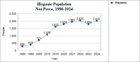 - The proportion of Hispanic residents has changed in Nez Perce from 0.9 percent in 1980, to 1.2 percent in 1990, to 1.9 percent in 2000, and to 4.7 percent in 2024.