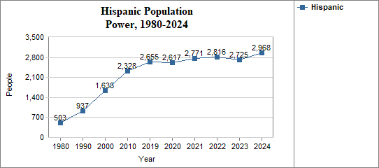 - The proportion of Hispanic residents has changed in Power from 7.3 percent in 1980, to 13.2 percent in 1990, to 21.7 percent in 2000, and to 35.4 percent in 2024.