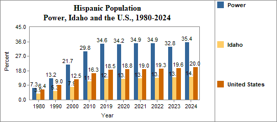 - Hispanic residents made up 35.4 percent of the population in 2024, compared to 14.3 percent in Idaho.