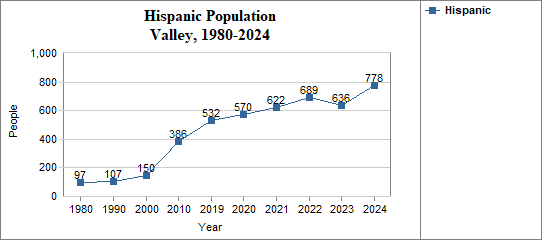 - The proportion of Hispanic residents has changed in Valley from 1.7 percent in 1980, to 1.8 percent in 1990, to 2.0 percent in 2000, and to 6.1 percent in 2024.