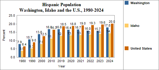 - The proportion of Hispanic residents has changed in Washington from 7.9 percent in 1980, to 10.7 percent in 1990, to 13.8 percent in 2000, and to 17.8 percent in 2024.