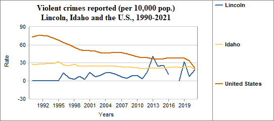 This indicator is calculated by dividing the number of reported incidences of violent crimes by the population. We multiply the result by 10,000. Violent crimes include murders and non-negligent manslaughter, rape, robbery, and aggravated assault. In counties with relatively few people, a small change in the number of violent crimes reported may have a significant effect on rates from year to year. (See the note about data comparability below.)