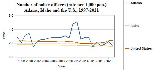 - There were 1.7 police officers per 1,000 people in 2021, compared to 1.5 in Idaho.
