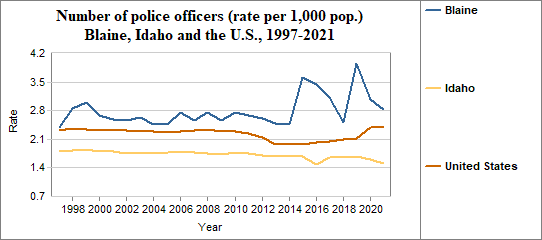 - There were 2.8 police officers per 1,000 people in 2021, compared to 1.5 in Idaho.