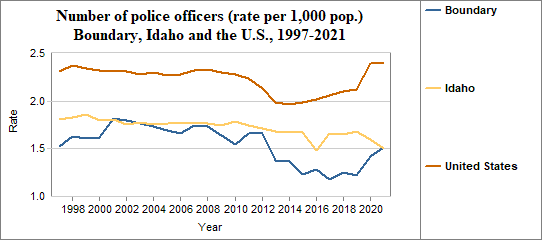 - There were 1.5 police officers per 1,000 people in 2021, compared to 1.5 in Idaho.