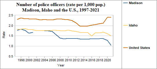 - There were 1.0 police officers per 1,000 people in 2021, compared to 1.5 in Idaho.