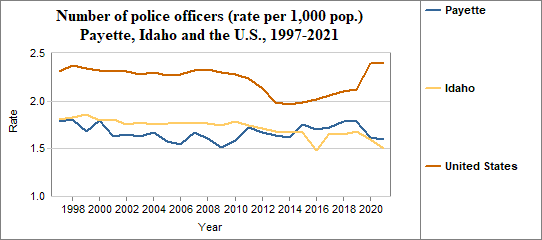 - There were 1.6 police officers per 1,000 people in 2021, compared to 1.5 in Idaho.