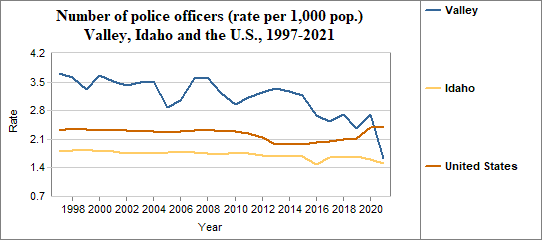 - There were 1.6 police officers per 1,000 people in 2021, compared to 1.5 in Idaho.