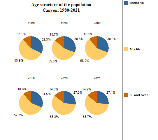 - 14.2 percent of the population was 65 or older in 2021, compared to 16.6 percent in Idaho