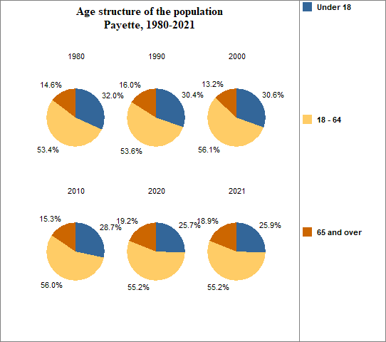 - 18.9 percent of the population was 65 or older in 2021, compared to 16.6 percent in Idaho
