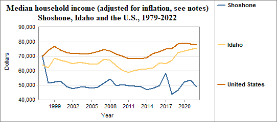 Median household income is the level of income at which half the population has lower incomes and half has higher incomes. Here, we provide information on real median household income, which means the data have been adjusted for inflation. In Shoshone median household income (adjusted for inflation) . . .